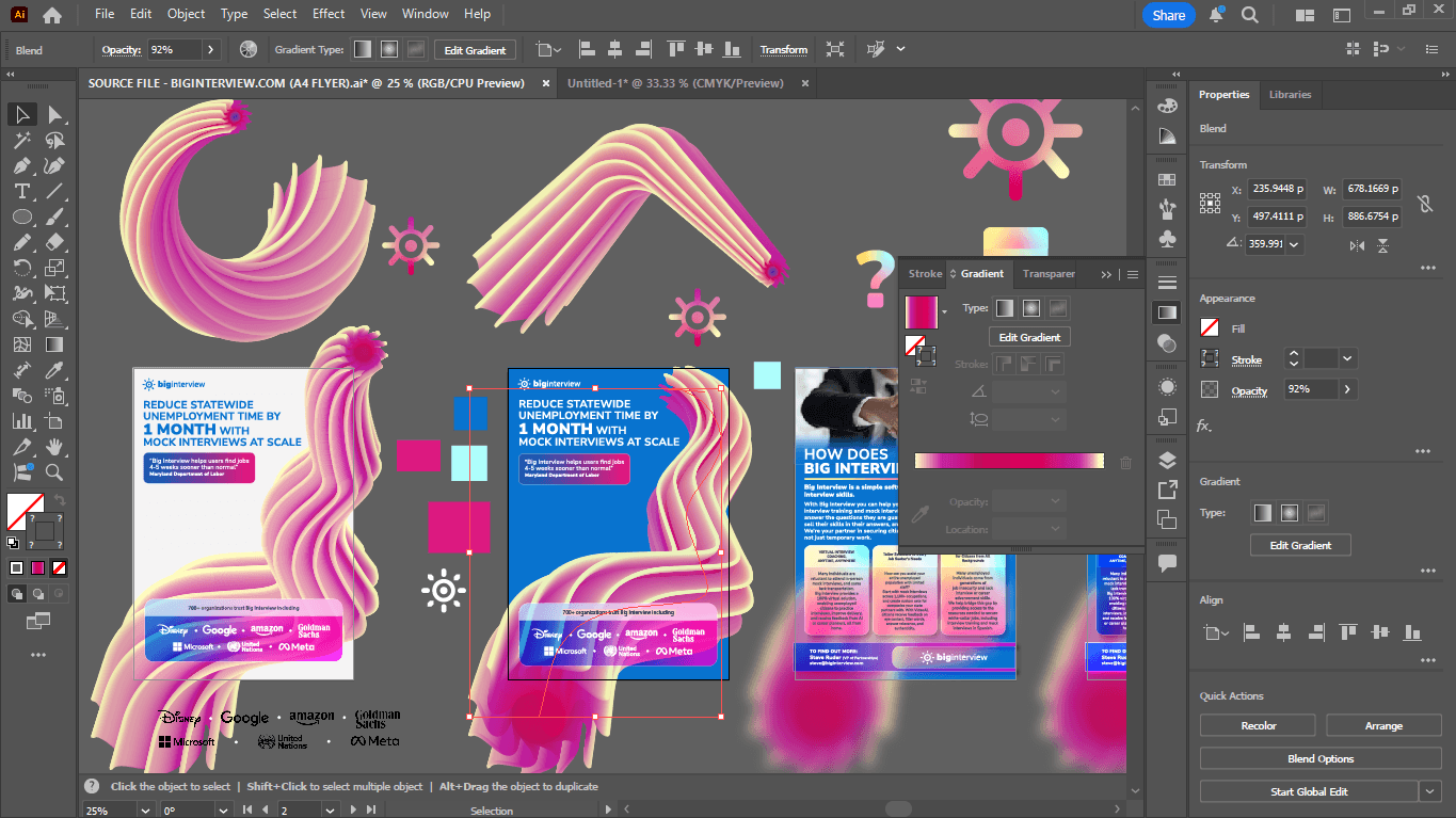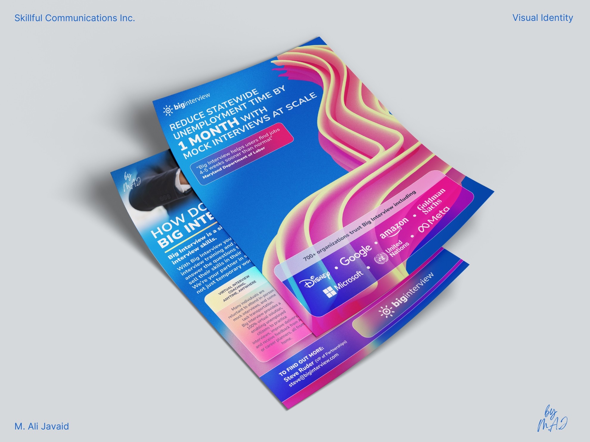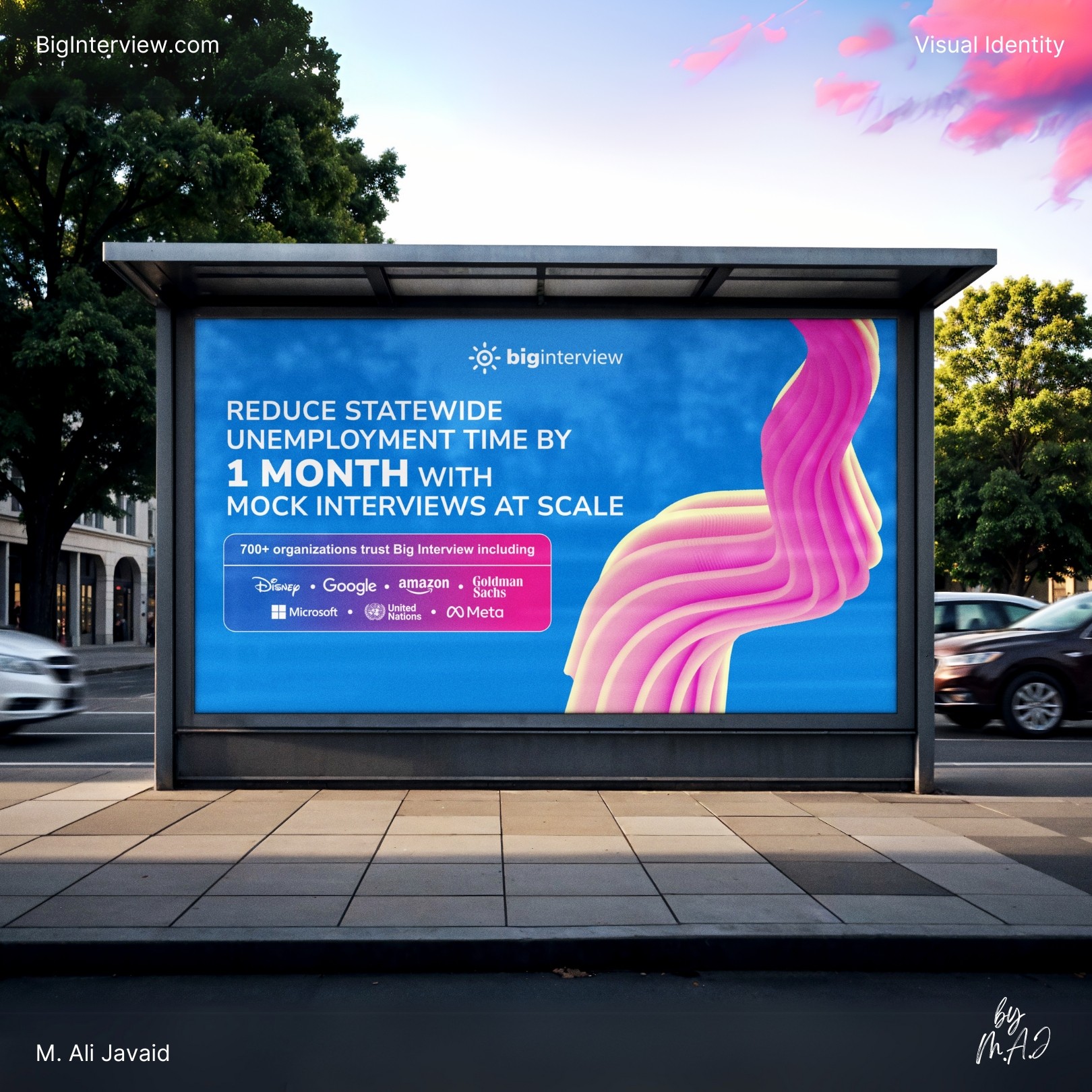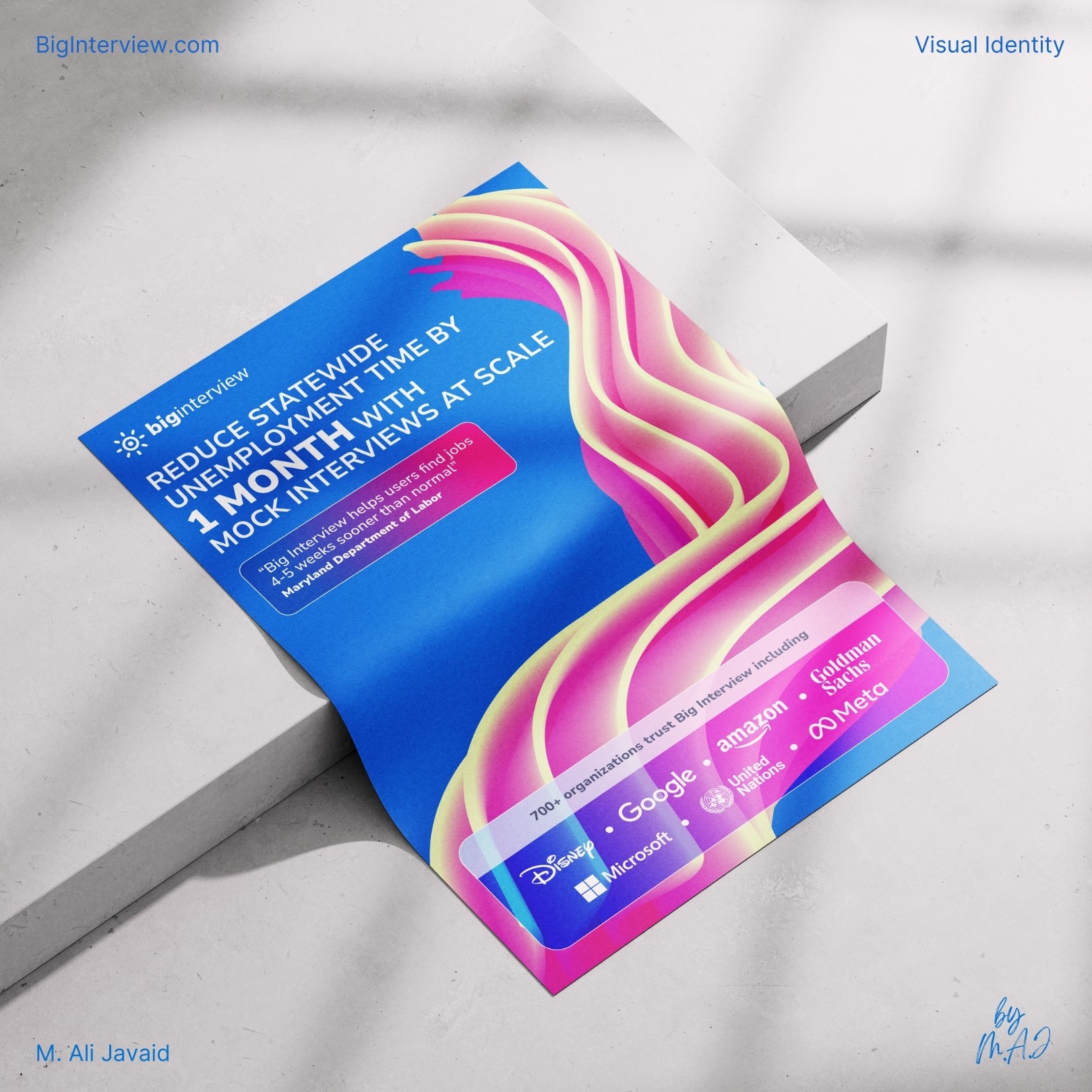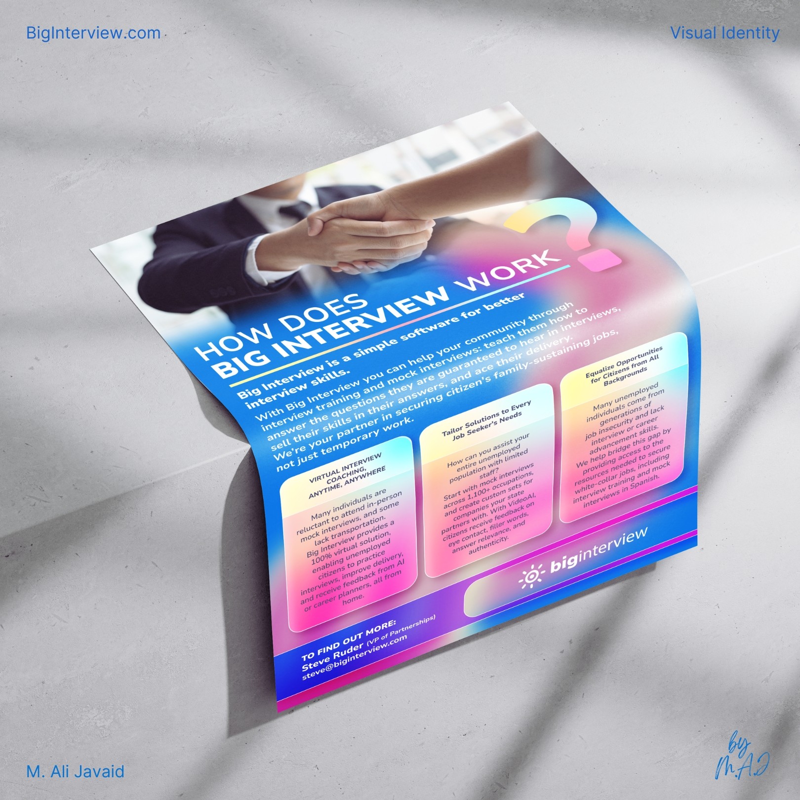 The goal was to test rebranding for a "job interview preparation SaaS-based service called BigInterview." It started with print design for conference distribution, ensuring a professional yet approachable identity.